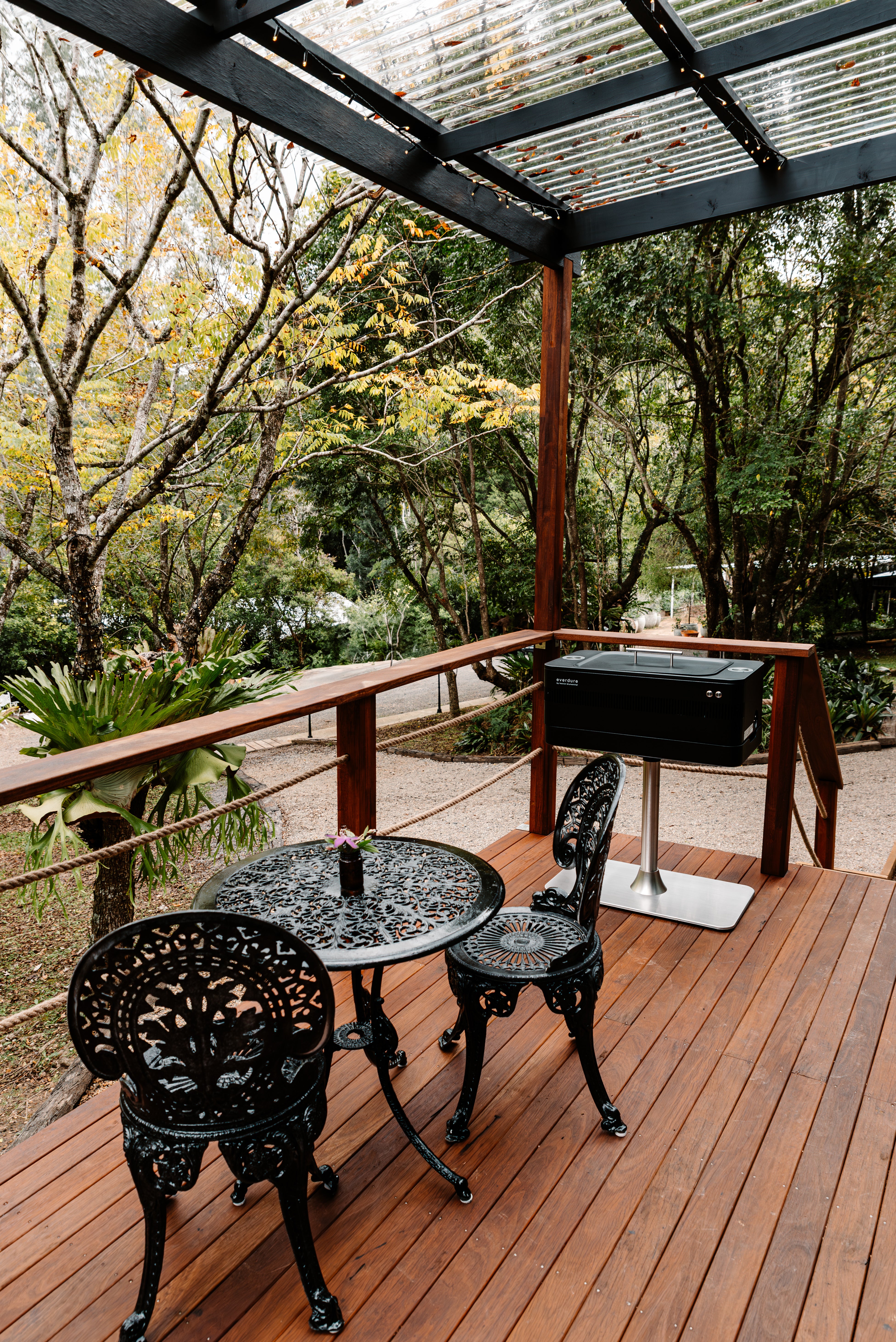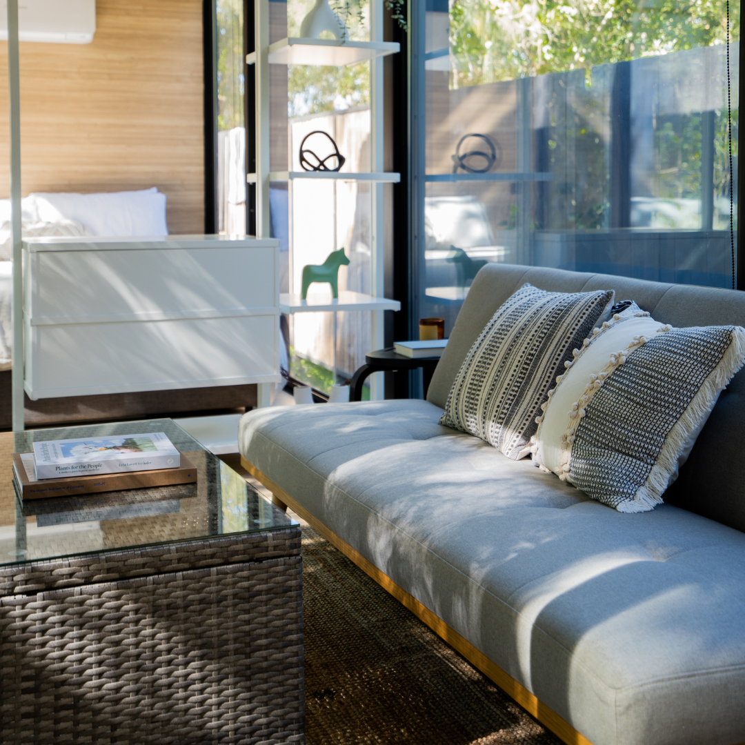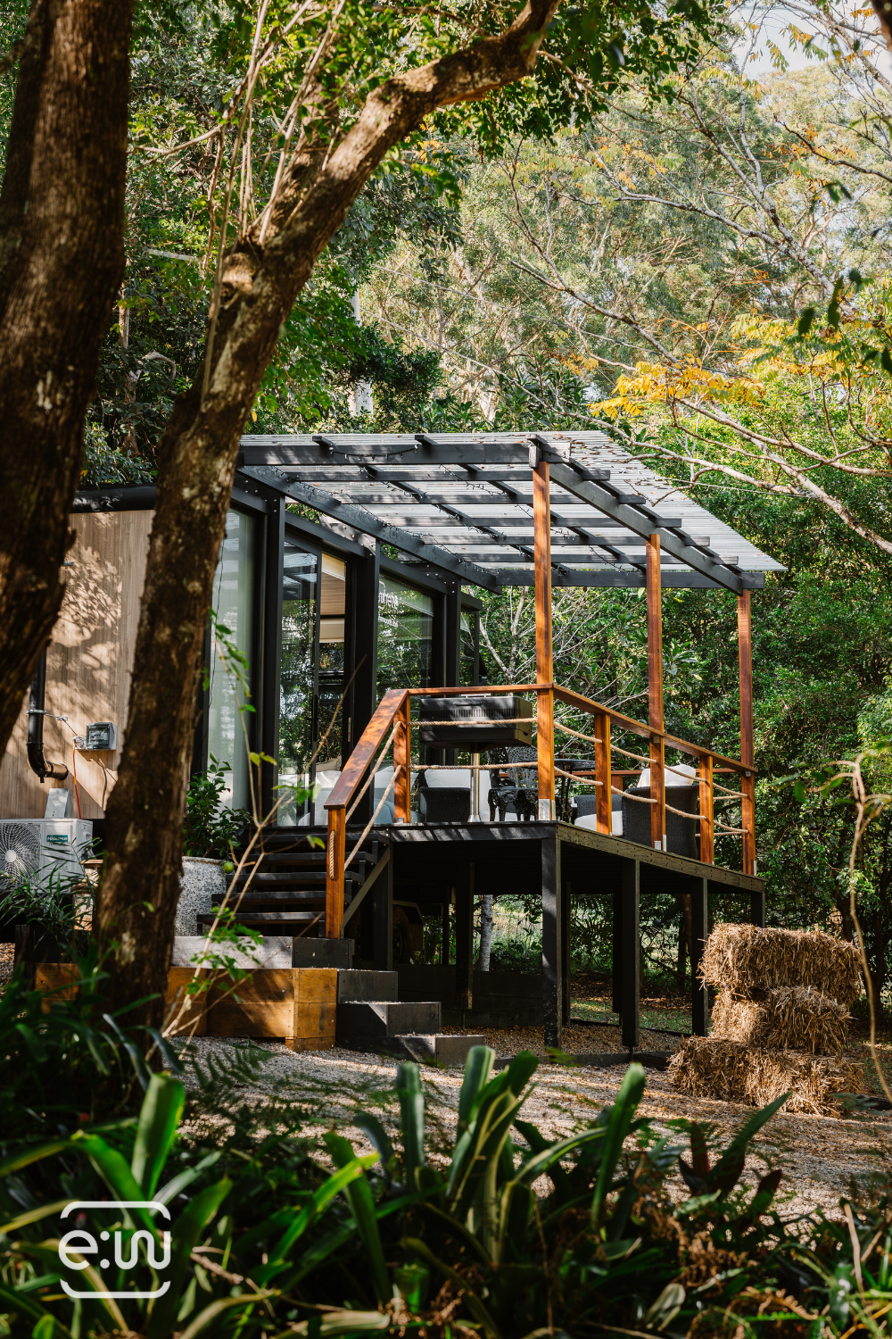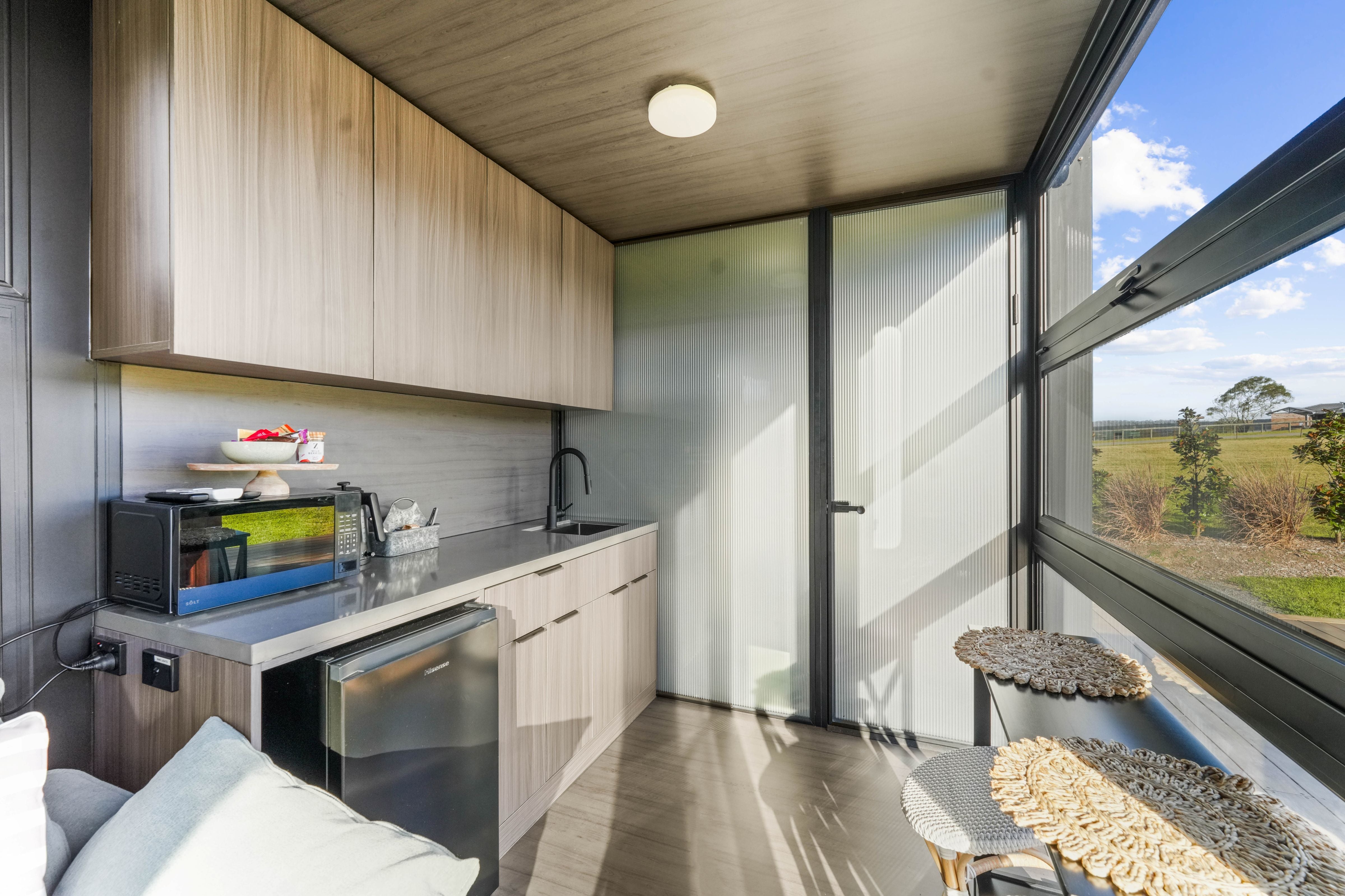 Inside, you'll find a cosy yet sophisticated space featuring a well-appointed kitchenette, a modern bathroom, and elegant furnishings from Koala, Tilecloud, and Lighting Collective. Floor-to-ceiling windows bring in natural light, creating a bright and airy atmosphere that enhances your connection to the surrounding landscape.