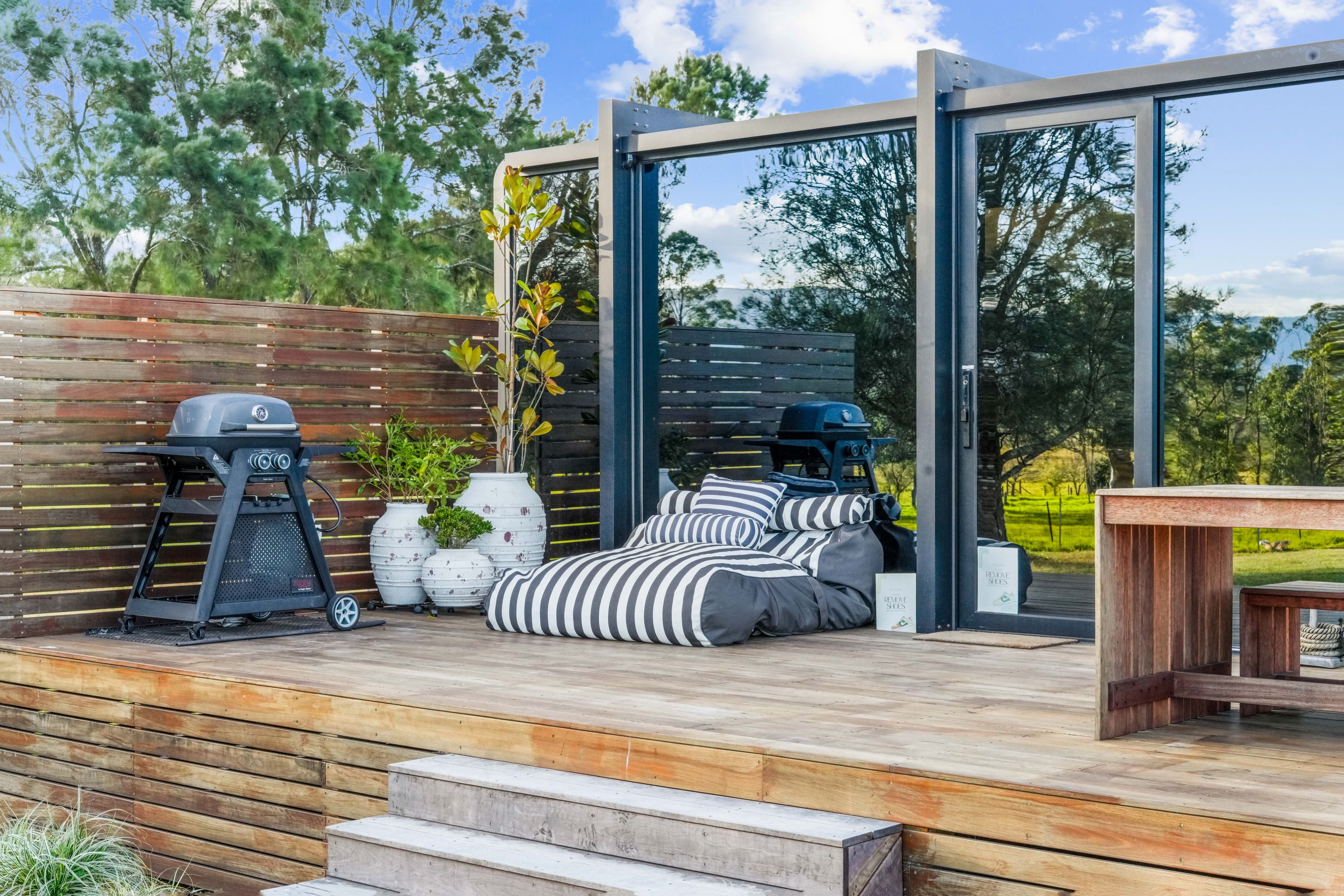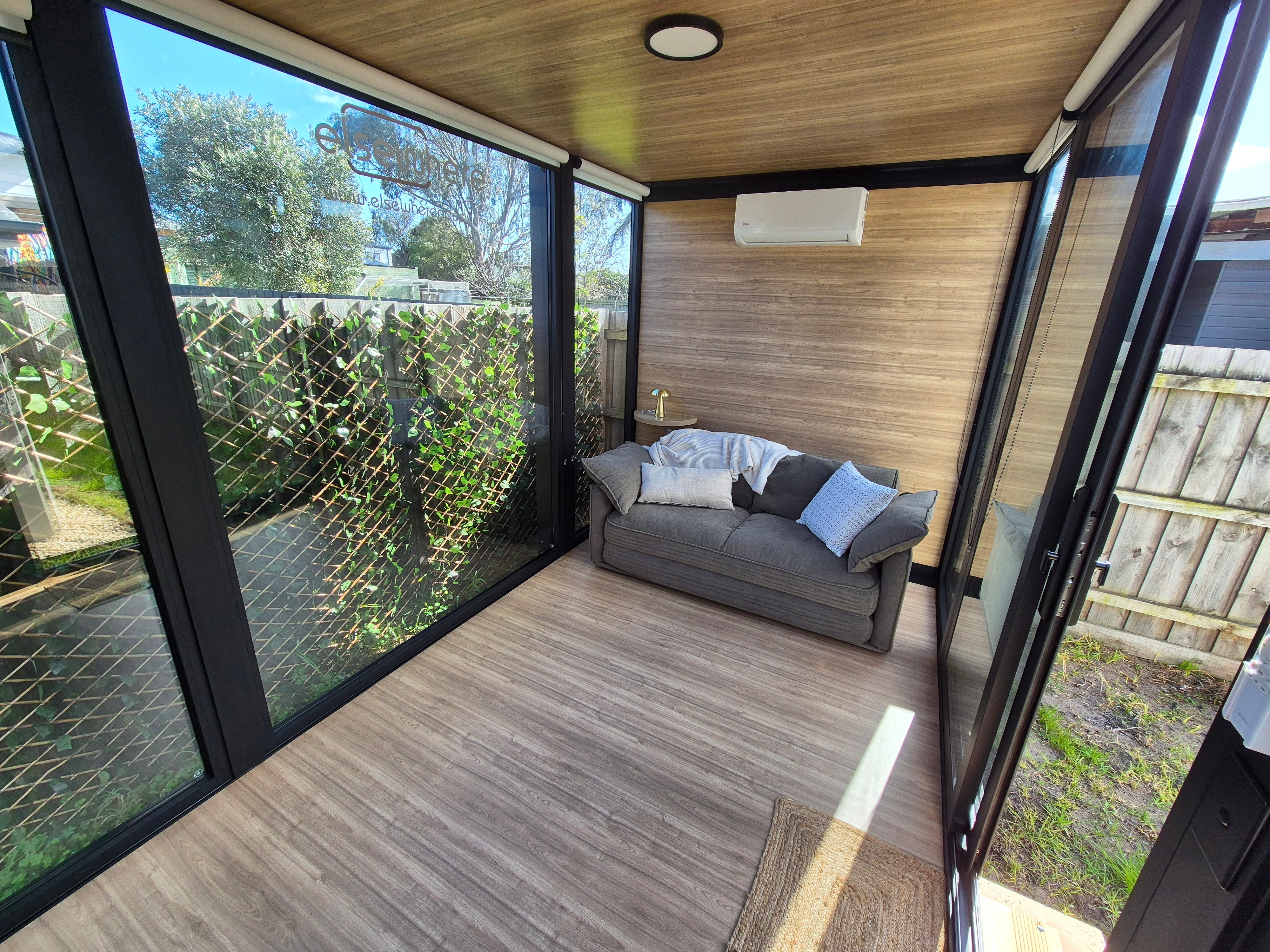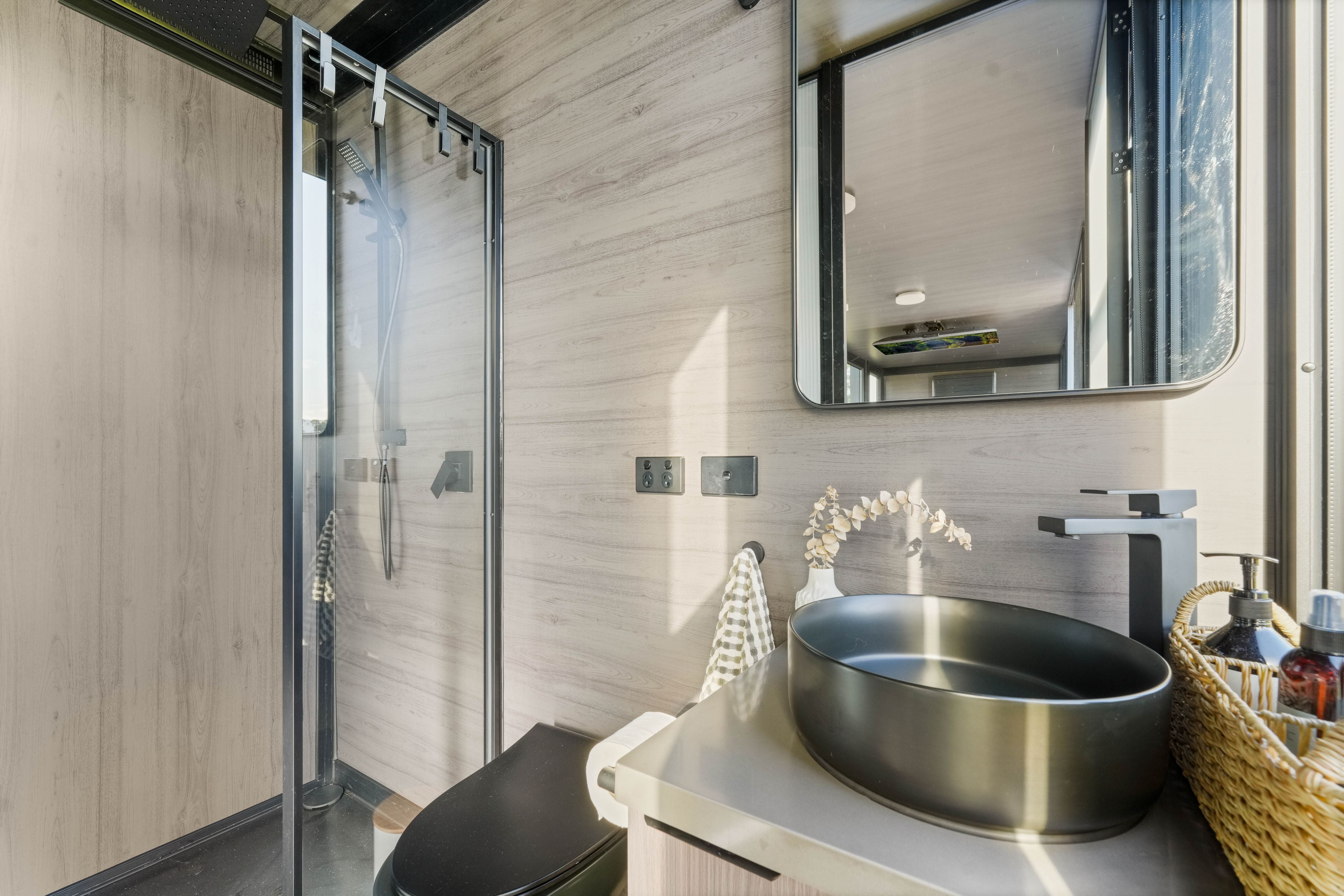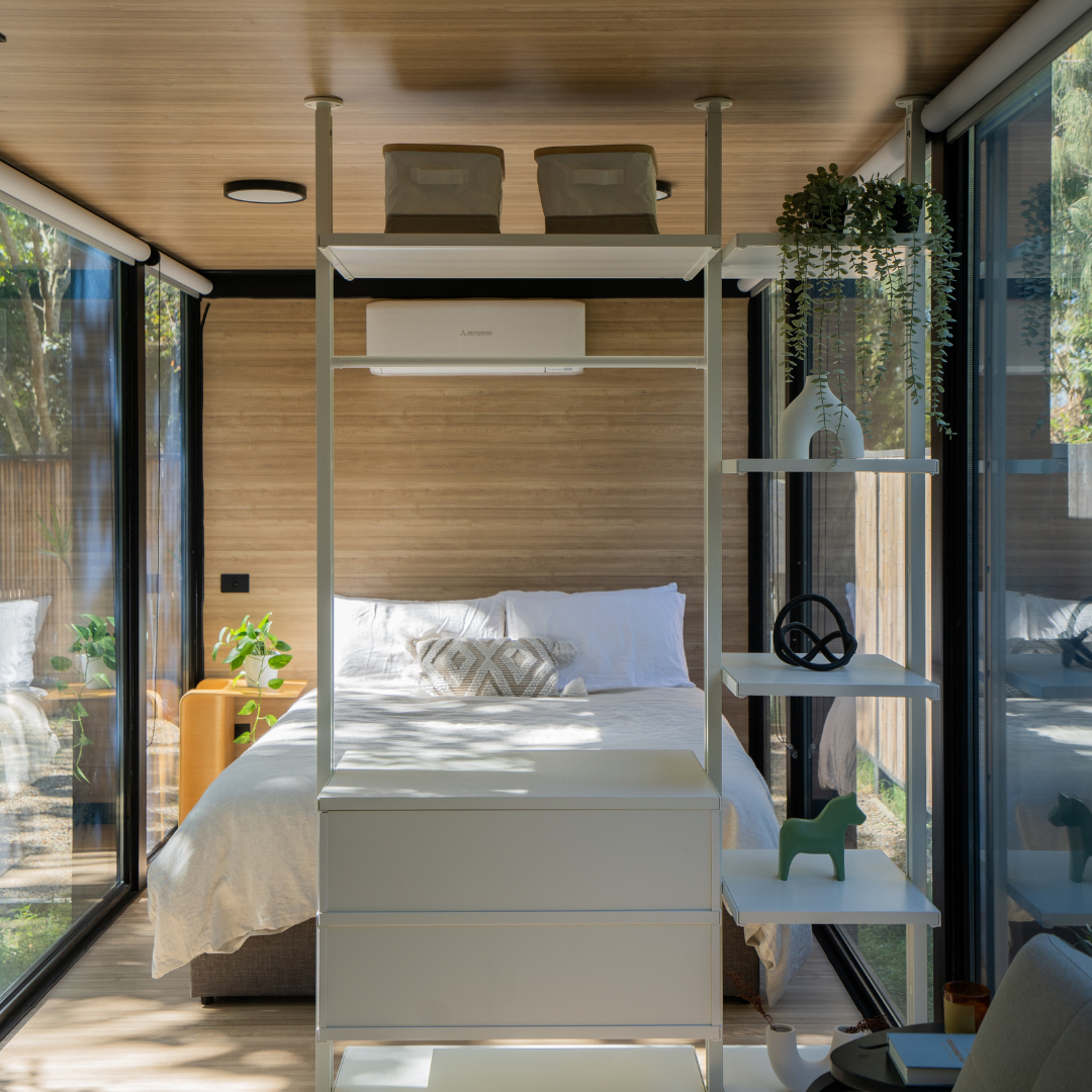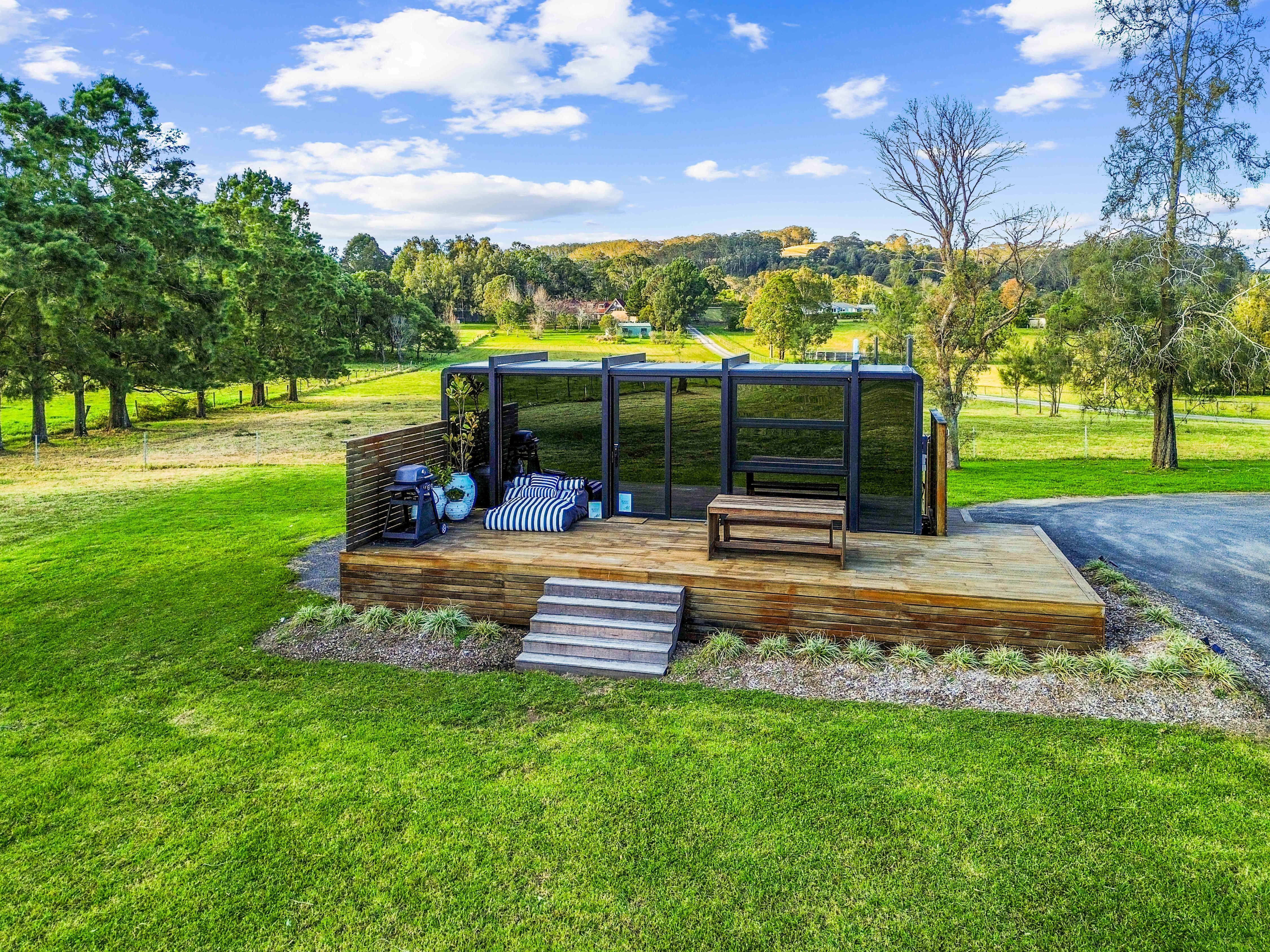 Inside, you'll find a cosy yet sophisticated space featuring a well-appointed kitchenette, a modern bathroom, and elegant furnishings from Koala, Tilecloud, and Lighting Collective. Floor-to-ceiling windows bring in natural light, creating a bright and airy atmosphere that enhances your connection to the surrounding landscape.